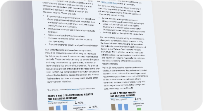 *2019 GHG data has been assured by Ernst & Young LLP. To learn more, read the external assurance statement. In 2021, we announced 2030 targets to reduce the GHG emissions intensity of our operations (Scope 1 and 2) and products (Scope 3) by 30% and 15%, respectively, from a 2019 baseline.* These medium-term targets are tied to projects currently underway and projects that are planned or under development consistent with the company’s disciplined approach to capital allocation and focus on returns. These projects: • Improve the energy efficiency of our operations • Grow production and blending of renewable fuels and lower-carbon supply chain products such as premium coke and lubricants • Produce commercial-scale low-carbon-intensity hydrogen • Capture carbon from our operations • Increase renewable power sources to use in our operations • Support enterprise growth and portfolio optimization Our 2030 targets are based on many factors, including planned projects that may be impacted by future equipment turnarounds and maintenance periods. These periods can vary by two to five years and may be affected by operational, materials or labor availability, and market demands. As a result, reductions are not anticipated to be ratable year over year. In 2021, we advanced permitting for conversion of our Rodeo facility, decided to convert the Alliance Refinery to a terminal and progressed several other lower-carbon initiatives. In 2022, we continue to progress our planned projects and are on track to meet our emissions intensity reduction targets. For more details on GHG data, see the Performance Data section of this report. Achieving our 2050 target to reduce Scope 1 and 2 manufacturing-related emissions intensity by 50% will require changes beyond Phillips 66’s sphere of influence and control, such as: • Advancements enabling broad commercial deployment and use of lower-carbon technologies • Global policies that fund and incentivize the development of a lower-carbon energy system • Changes in consumer behavior and energy choices • Available materials throughout the supply chain Our commitment to sustainability is also reflected in changes to our employee bonus program. In 2021, the board’s Human Resources and Compensation Committee increased the weighting of environmental factors in our Variable Cash Incentive Program from 5% to 15%. In addition, we added metrics for advancing lower-carbon investments, optimization and innovation, reducing manufacturing emissions intensity, and setting GHG emissions-intensity reduction targets. Phillips 66 recognizes the importance of credible disclosure to shareholders. Reputational and potential economic harm could result from setting emissions reduction targets outside our current understanding of feasible and economic pathways. We are committed to reassessing our targets in step with technological developments, policy changes and consumer energy demand trends. 30% reduction from baseline 50% reduction from baseline 2019 Baseline 2019 Baseline 2020 Actual 2021 Actual 2030 Target 15% reduction from baseline 36.5 380 374 *Ernst & Young LLP provided limited assurance for certain 2019 GHG data 366 323 37. 3 37. 5 25.5 17.6 2021 Actual 2030 Target 2050 Target 2020 Actual (Metric Tons CO 2 e/MBOE) (Metric Tons CO 2 e/MBOE) 53 53 GOVERNANCE SCOPE 1 AND 2 MANUFACTURING-RELATED GHG EMISSIONS INTENSITY SCOPE 3 PRODUCT-RELATED GHG EMISSIONS INTENSITY