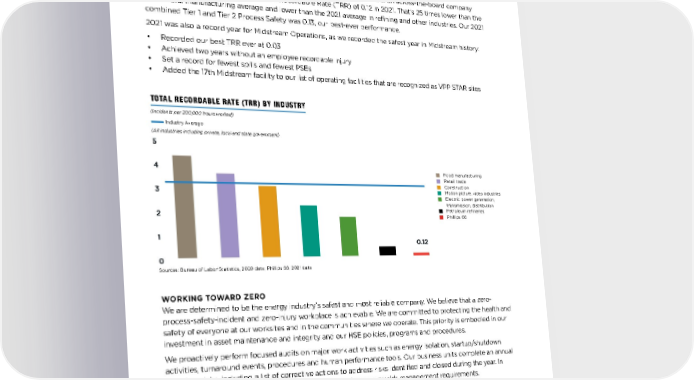 Safety Performance Our safety culture, comprehensive HSE policies, management systems and an across-the-board company commitment resulted in an OSHA Total Recordable Rate (TRR) of 0.12 in 2021. That’s 25 times lower than the overall U.S. manufacturing average and lower than the 2021 average in refining and other industries. Our 2021 combined Tier 1 and Tier 2 Process Safety was 0.13, our best-ever performance. 2021 was also a record year for Midstream Operations, as we recorded the safest year in Midstream history: • Recorded our best TRR ever at 0.03 • Achieved two years without an employee recordable injury • Set a record for fewest spills and fewest PSEs • Added the 17th Midstream facility to our list of operating facilities that are recognized as VPP STAR sites Sources: Bureau of Labor Statistics, 2020 data; Phillips 66, 2021 data TOTAL RECORDABLE RATE (TRR) BY INDUSTRY 5 4 3 2 1 0 0.12 Industry Average n Food manufacturing n Retail trade n Construction n Motion picture, video industries n Electric power generation, transmission, distribution n Petroleum refineries n Phillips 66 (Incidents per 200,000 hours worked) (All industries including private, local and state government) WORKING TOWARD ZERO We are determined to be the energy industry's safest and most reliable company. We believe that a zero- process-safety-incident and zero-injury workplace is achievable. We are committed to protecting the health and safety of everyone at our worksites and in the communities where we operate. This priority is embodied in our investment in asset maintenance and integrity and our HSE policies, programs and procedures. We proactively perform focused audits on major work activities such as energy isolation, startup/shutdown activities, turnaround events, procedures and human performance tools. Our business units complete an annual report on risks, including a list of corrective actions to address risks identified and closed during the year. In addition, business unit managers verify compliance with company risk management requirements. The reports are reviewed and signed off by each subsequent level of management. Ultimately, a complete report containing the status of risk items throughout the company is developed, reviewed with the chairman and CEO, and summarized for the Public Policy and Sustainability Committee. Safety and environmental performance are part of our compensation structure for executives and employees. We measure ourselves against the best performers in our industry and target top-quartile performance in safety, environmental stewardship and effective management of unplanned downtime. 21 ENVIRONMENT AND SAFETY
