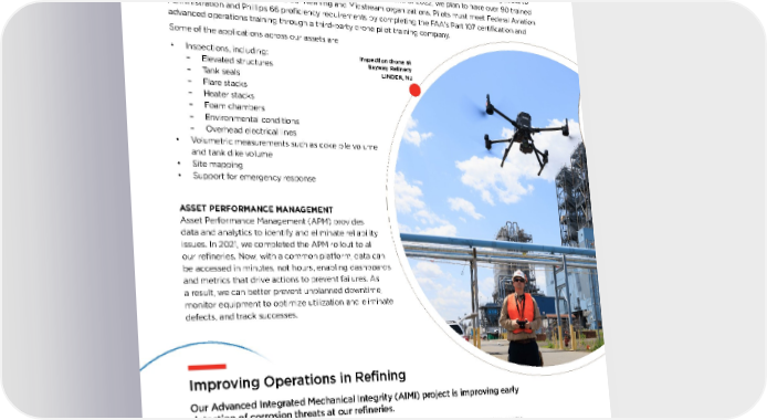 ASSET PERFORMANCE MANAGEMENT Asset Performance Management (APM) provides data and analytics to identify and eliminate reliability issues. In 2021, we completed the APM rollout to all our refineries. Now, with a common platform, data can be accessed in minutes, not hours, enabling dashboards and metrics that drive actions to prevent failures. As a result, we can better prevent unplanned downtime, monitor equipment to optimize utilization and eliminate defects, and track successes. Improving Operations in Refining Our Advanced Integrated Mechanical Integrity (AIMI) project is improving early detection of corrosion threats at our refineries. In 2021, we completed pilot programs at our Borger and Ferndale refineries, uncovering many opportunities to improve our inspection program and several near-miss inspection findings that were subsequently repaired. This proactive approach reduces lost-profit opportunities and improves safety, environmental and turnaround performance. AIMI takes a risk-based approach to systematically standardize, validate and digitize our design and process information. It improves inspection planning because we are using leading-edge software and analytical tools, communicating across operating groups, improving access to information, linking corrosion threats to specific equipment, and facilitating cross-site sharing of findings. DRONE TECHNOLOGY Drones allow us to monitor assets from a safe distance and at various elevations while also allowing pilots to zoom in and take close-up images to identify anomalies. By the end of 2022, we plan to have over 90 trained and qualified drone pilots across our Refining and Midstream organizations. Pilots must meet Federal Aviation Administration and Phillips 66 proficiency requirements by completing the FAA's Part 107 certification and advanced operations training through a third-party drone pilot training company. Some of the applications across our assets are: • Inspections, including: – Elevated structures – Tank seals – Flare stacks – Heater stacks – Foam chambers – Environmental conditions – Overhead electrical lines • Volumetric measurements such as coke pile volume and tank dike volume • Site mapping • Support for emergency response Inspection drone at Bayway Refinery LINDEN, NJ 26 PHILLIPS 66 2022 SUSTAINABILITY REPORT OUR BUSINESSES: TODAY AND TOMORROW ENVIRONMENT AND SAFETY GOVERNANCE STAKEHOLDER ENGAGEMENT