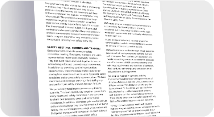 STOP-WORK AUTHORITY Two principles that guide all employees and contractors working within our facilities are taking the time to work safely and having the right to speak up and stop work if a safety concern is identified. Everyone working at or visiting our sites is empowered — and required — to stop any work they believe poses a risk to themselves, the people around them or the environment. We train our workforce to "stop when unsure." No employee or contractor will ever experience negative repercussions for using their stop-work authority in good faith, even if it turns out that there wasn’t a hazard; in fact, employees and contractors who speak up when they spot a potential problem are rewarded through the company’s Good Catch program. It’s another way we hold ourselves accountable for everyone’s safety every day. SAFETY MEETINGS, SUMMITS AND TRAINING Each of our sites conducts a monthly safety committee meeting. Employees, managers and union representatives review goals and safety practices. They also audit results and work together to keep an open dialogue focused on continuous improvement. In addition to providing continuing education opportunities, these meetings enable knowledge- sharing from experts such as industrial hygienists, safety specialists and process safety representatives. We have more frequent meetings within our field staff groups and perform job safety analyses for each field job. We periodically host large-scale company training summits. This is an opportunity to gather people from every health and safety committee in the company to share best practices, goals and performance milestones. In addition, attendees gain new techniques, skills and knowledge they can implement at their home facility. The summits also encourage union leaders and Phillips 66 management to maintain an open dialogue and speak with a unified voice about safety. We also hold periodic contractor safety summits with all our major contracting companies to set expectations and goals, share best practices, and keep lines of communication open. Each Midstream Region holds a regional contractor summit with its primary and secondary contractors. In 2021, in compliance with COVID-19 restrictions, we held a virtual summit with select primary contractors and contractor mentors. AUDITS AND INSPECTIONS Our facilities are subject to rigorous internal, industry and external audits and inspections, and our operations are managed to ensure compliance and asset integrity. There are hundreds of audits each year across our operations. External auditing agencies include OSHA and the U.K. Health and Safety Executive, the EPA and U.K. Environmental Agency, U.S. Coast Guard, Pipeline and Hazardous Materials Safety Administration and the Chemical Safety Board. HSE audits are on a predetermined cycle that covers all operations. Additionally, refinery operating excellence audits, insurance risk assessments, trade association assessments and third-party safety audits happen each year. Audits are documented and include a process for communicating results to management and provisions for periodic review and corrective actions. HSE performance is verified through robust assurance processes that involve corporate staff and business unit employees. Each business unit establishes and maintains auditing processes to assess the adequacy and effectiveness of HSE controls and compliance with legal requirements and standards of operation. Joint ventures, partnerships and contractors are all included in the auditing process. We are also involved in numerous industry improvement and standard-setting committees of American Petroleum Institute (API), American Fuel & Petrochemical Manufacturers (AFPM) and the Association of Oil Pipe Lines. Our facilities follow industry-leading quality management systems, and many are certified to international standards. These efforts have made our sector, and specifically Phillips 66, a safety leader among U.S. industries. Through our occupational health and industrial hygiene program, we evaluate our workplaces for health hazards to ensure that we protect everyone at our facilities. Employees and contractors report both actual incidents and near misses that have or could have resulted in injury, property damage or environmental impact. We learn from these situations, identifying and removing the root causes to reduce the risk of recurrence. 23 ENVIRONMENT AND SAFETY