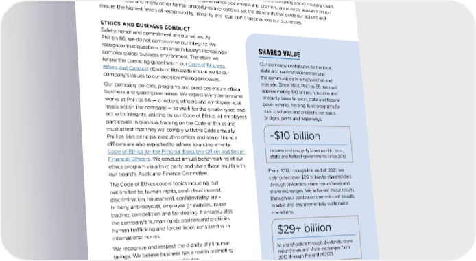 Ethics and Governance Written policies and auditing programs create strong governance throughout the company and our supply chain. Key policies and documents, including board governance documents and charters, are publicly available on our website. These and many other formal procedures and controls set the standards that guide our actions and ensure the highest levels of responsibility, integrity and legal compliance across our businesses. ETHICS AND BUSINESS CONDUCT Safety, honor and commitment are our values. At Phillips 66, we do not compromise our integrity. We recognize that questions can arise in today's increasingly complex global business environment. Therefore, we follow the operating guidelines in our Code of Business Ethics and Conduct (Code of Ethics) to ensure we tie our company's values to our decision-making processes. Our company policies, programs and practices ensure ethical business and good governance. We expect every person who works at Phillips 66 — directors, officers and employees at all levels within the company — to work for the greater good and act with integrity, abiding by our Code of Ethics. All employees participate in biannual training on the Code of Ethics and must attest that they will comply with the Code annually. Phillips 66’s principal executive officer and senior financial officers are also expected to adhere to a supplemental Code of Ethics for the Principal Executive Officer and Senior Financial Officers . We conduct annual benchmarking of our ethics program via a third party and share those results with our board's Audit and Finance Committee. The Code of Ethics covers topics including, but not limited to, human rights, conflicts of interest, discrimination, harassment, confidentiality, anti- bribery, anti-boycott, employee grievances, insider trading, competition and fair dealing. It encapsulates the company's human rights position and prohibits human trafficking and forced labor, consistent with international norms. We recognize and respect the dignity of all human beings. We believe business has a role in promoting respect for human rights worldwide. We embrace the right of all people to live their lives free from social, political or economic discrimination or abuse. It oversees the integrity of financial reporting and financial statements. The United Nations Universal Declaration of Human Rights informs our Position on Human Rights . We don’t use corporal punishment, and where we provide housing for employees, we ensure living conditions are safe and sanitary. SHARED VALUE Our company contributes to the local, state and national economies and the communities in which we live and operate. Since 2012, Phillips 66 has paid approximately $10 billion in income and property taxes to local, state and federal governments, helping fund programs for public schools and projects like roads, bridges, ports and waterways. From 2012 through the end of 2021, we distributed over $29 billion to shareholders through dividends, share repurchases and share exchanges. We achieved these results through our continued commitment to safe, reliable and environmentally sustainable operations. Global Ethics Toll-free Help Line 855-318-5390 ~$10 billion income and property taxes paid to local, state and federal governments since 2012 $29+ billion to shareholders through dividends, share repurchases and share exchanges from 2012 through the end of 2021 41 GOVERNANCE