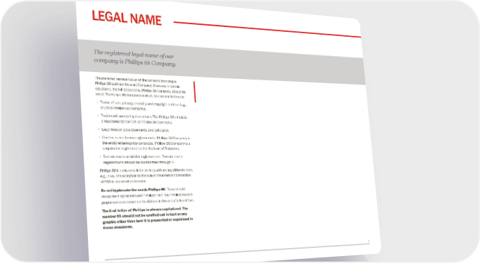 4 LEGAL NAME The preferred representation of the company branding is Phillips 66 (without the word Company); however, in certain situations, the full trade name, Phillips 66 Company, should be used. These specific instances include, but are not limited to: • T erms of use, privacy, security and copyright notices (e.g., © 2018 Phillips 66 Company). • T rademark ownership statement: The Phillips 66 shield is a registered trademark of Phillips 66 Company. • L egal lines in advertisements and collateral. • C ontracts and license agreements: Phillips 66 Company is the entity entering into contracts. Phillips 66 Company is a corporation registered under the laws of Delaware. • D omain name or similar registrations. Domain name registrations should be coordinated through IT. Phillips 66 is to be used in its entirety without any abbreviations, e.g., P66. The exception to this rule is the internal abbreviation of P66 in our email addresses. Do not hyphenate the words Phillips 66. There should always be a space between "Phillips" and "66." Phillips 66 is a proper name and must not be divided at the end of a line of text. The first letter of Phillips is always capitalized. The number 66 should not be spelled out in text or any graphic other than how it is presented or explained in these standards. The registered legal name of our company is Phillips 66 Company.