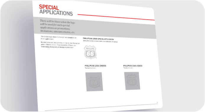17 SPECIAL APPLICATIONS The sample logos shown to the right are appropriate for these applications. Be sure to request test samples or imprints from the vendor prior to final execution. Every material is different, and maintaining the legibility of the logo is paramount. PHILLIPS 66 LOGO: SPECIAL APPLICATION Spot varnish or tone-on-tone for print and etched glass for signage. There will be times when the logo will be used for such special applications as promotions, invitations, announcements, etc. PHILLIPS 66 LOGO: EMBOSS Two-level emboss. PHILLIPS 66 LOGO: DEBOSS Two-level deboss.