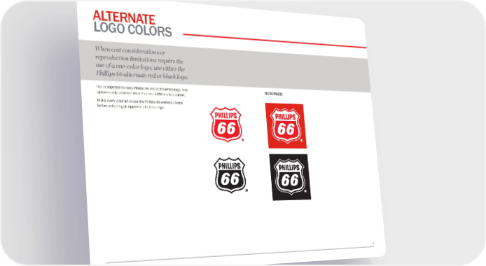 7 ALTERNATE LOGO COLORS It is acceptable to apply Phillips 66 red to the entire logo. This option is only available when Pantone 485C red is available. Make every attempt to use the Phillips 66 preferred logos before selecting an approved alternate logo. When cost considerations or reproduction limitations require the use of a one-color logo, use either the Phillips 66 alternate red or black logo. REVERSED