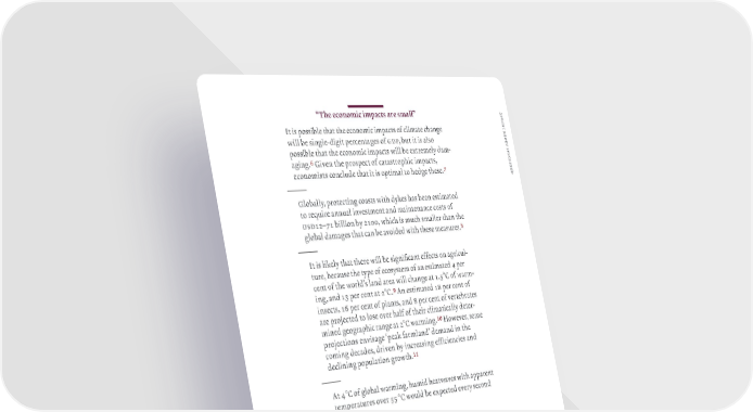 — t “The economic impacts are small” c a p ‹t is possible that the economic impacts of climate chane m t i u will be sinle„diit percentaes of gdp but it is also o b possible that the economic impacts will be extremel dam„ s a n o ain‚^ Œien the prospect of catastrophic impacts i t s economists conclude that it is optimal to hede these‚& e u q — Œloball protectin coasts with dƒes has been estimated to reuire annual inestment and maintenance costs of usd12–¡1 billion b 2100 which is much smaller than the lobal damaes that can be aoided with these measures‚* — ‹t is liƒel that there will be sinificant effects on aricul„ ture because the tpe of ecosstem of an estimated ‘ per cent of the world’s land area will chane at 1‚”°C of warm„ in and 1 per cent at 2°C‚( n estimated 1— per cent of insects 1Ÿ per cent of plants and — per cent of ertebrates are prošected to lose oer half of their climaticall deter„ mined eoraphic rane at 2°C warmin‚!) Howeer some prošections enisae ‘peaƒ farmland’ demand in the comin decades drien b increasin efficiencies and declinin population rowth‚!! — t ‘ °C of lobal warmin humid heatwaes with apparent temperatures oer ”” °C would be expected eer second ear‚!@ — ‹f the increase in lobal aerae temperature exceeds Ÿ°C wet„bulb temperatures will bein to permanentl exceed sƒin temperature in some areas of the lobe ›i‚e‚ the human bod will lose its abilit to shed heat as sweatin becomes Ÿ ¢urƒe et al‚ 201”ª — Hinƒel et al‚ 201‘ ˆretis et al‚ 201— ž Hoeh„Œuldber ¡ £itterman 201ª et al‚ 201— Daniel et al‚ 201Ÿ 1 0 Šarren et al‚ 201— 1 1 usubel et al‚ 201 1 2 ’usso et al‚ 201¡ ‘