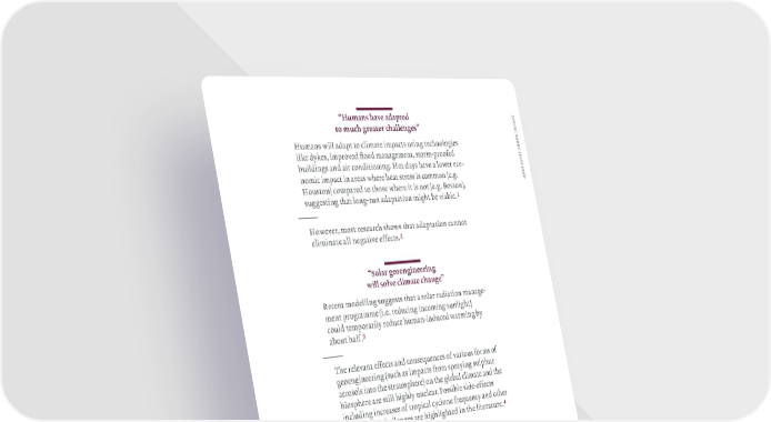 — t “„umans ha ve adapted c a to much reater challenes” p m t i u Humans will adapt to climate impacts usin technoloies o b liƒe dƒes improed flood manaement storm„proofed s a n o buildins and air conditionin‚ Hot das hae a lower eco„ i t s nomic impact in areas where heat stress is common ›e‚‚ e u Houstonœ compared to those where it is not ›e‚‚ ¢ostonœ q suestin that lon„run adaptation miht be iable‚! — Howeer most research shows that adaptation cannot eliminate all neatie effects‚@ — “Œolar eoenineerin will solve climate chane” ’ecent modellin suests that a solar radiation manae„ ment proramme ›i‚e‚ reducin incomin sunlihtœ could temporaril reduce human„induced warmin b about half‚# — …he releant effects and conseuences of arious forms of eoenineerin ›such as impacts from sprain sulphur aerosols into the stratosphereœ on the lobal climate and the biosphere are still hihl unclear‚ ˆossible side„effects includin increases of tropical cclone freuenc and other eopolitical challenes are hihlihted in the literature‚$ 1 Heal ¦ ˆarƒ 201Ÿ 2 der et al‚ 200žª Moser ¦ Eƒstrom 2010ª Dow et al‚ 201 ‹rine et al‚ 201ž ‘ °ones et al‚ 201¡ ‘0