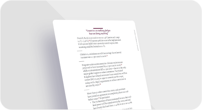 — d “‚ountries are ma in pledes e r but not doin anythin” a h ly s Oerall Earth is on tracƒ to warm 2‚ž°C ›estimated rane l a u 2‚1°C – ‚ž°Cœ !# if current policies were to be implemented‚ q e ‹f all nations fulfill their currentl stated tarets then n s u warmin could be limited to 2‚1°C‚ e i s n o — p s e Œlobal co2 emissions are still increasinª the estimated r increase was 2‚¡ per cent in 201—‚!$ — ˆroress aries across countries‚ Chinese emissions are prošected to hae increased b ‘‚¡ per cent in 201— !% while eu2— emissions fell 0‚¡ per cent — the eu is the onl mašor lobal reion to reduce emissions‚ …he ‡nited §indom has reduced emissions from around —00 million tonnes ›Mtœ co2e in 1žž0 to around ”00 Mt co2e toda with a leal reuirement to reduce emissions to net„zero b 20”0‚!^ — More than ”2 other countries states and proinces hae šoined an areement to completel phase out coal before 200‚!& ‹n particular • …he u Secretar of State announced in 201” that coal„ fired power will be closed entirel b 202”ª and coal has alread declined from 11‚‘ Mt in 2010 to 1‚ž Mt in 201¡‚!* • …he Canadian Œoernment announced in 201— that coal„fired power will be phased out and closed entirel b 200‚!( • …he Œerman Œoernment announced in 201ž that coal„fired power will be phased out and closed entirel b 20—‚@) 1 Climate ction 1¡ ˆowerin ˆast Coal …racƒer 2020 lliance 201— 1‘ Œlobal Carbon 1— …widale 201”ª u ¢udet 201— Ener ¢rief 201— 1” ibid 1ž Œoernment of 1Ÿ u Statutor ‹nstru„ Canada 201— ments 201ž 20 Šacƒet 201ž ””