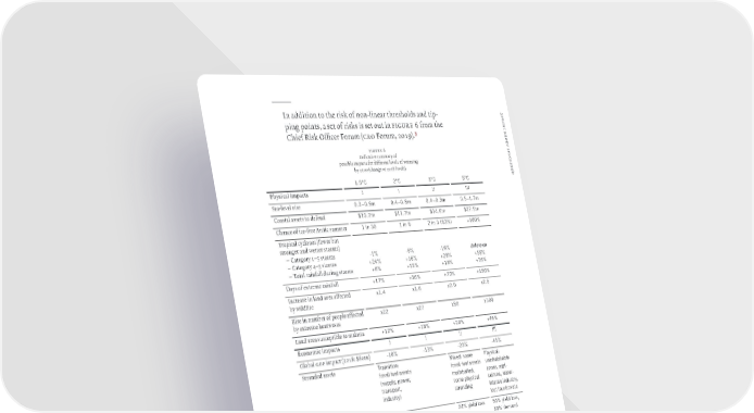 — ‹n addition to the risƒ of non„linear thresholds and tip„ t c a pin points a set of risƒs is set out in figure from the p m Chief ’isƒ Officer Žorum ›cro Žorum 201žœ‚% t i u o b figure s a ‹ndicatie summar of n o possible impacts for different leels of warmin i t b 2100 ›chane s 201— leelsœ s e u 1.5°C 2°C 3°C 5°C q ‹hysical impacts ! ! !! !!! Sea„leel rise 0.3–0.6m 0.4–0.8m 0.4–0.9m 0.5–1.7m Coastal assets to defend $10.2tn $11.7tn $14.6tn $27.5tn Chance of ice„free rctic summer 1 in 30 1 in 6 2 in 3 (63%) ≈100% …ropical cclones ›fewer but stroner and wetter stormsœ – Cateor 1–” storms -1% -6% -16% Unknown – Cateor ‘–” storms +24% +16% +28% +55% – …otal rainfall durin storms +6% +12% +18% +35% Das of extreme rainfall +17% +36% +70% +150% ‹ncrease in land area affected x1.4 x1.6 x2.0 x2.6 b wildfire ’ise in number of people affected x22 x27 x80 x300 b extreme heatwaes £and area susceptible to malaria +12% +18% +29% +46% ˆconomic impacts ! ! !! !!! Œlobal gdp impact ›201— ¸—0tnœ -10% -13% -23% -45% Stranded assets Transition: Mixed: some Physical: fossil fuel assets fossil fuel assets uninhabitable (supply, power, mothballed, zones, agri- transport, some physical culture, water - industry) stranding intense industry, lost tourism etc Žood suppl Changing diets, 24% yield loss 60% yield loss, some yield loss 60% demand in tropics increase ‹nsurance opportunities New low-car- Increasing de- Minimal: reces- bon assets and mand to manage sion, tensi- infrastructure growing risks ons, high and investment un predictable ” cro Žorum 201ž (e.g.CCS) risks Source: CRO Forum, 2019, p.5