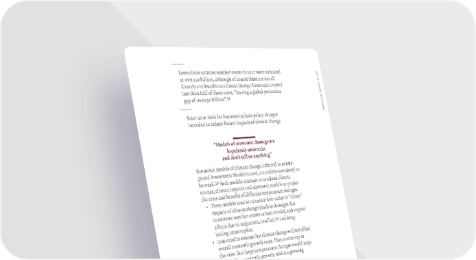 — £osses from extreme weather eents in 201¡ were estimated t c a at usd0 billion althouh of course these are not all p m directl attributable to climate chane‚ ‹nsurance coered t i u o less than half of those costs “leain a lobal protection b s a ap of usd1ž2 billion”‚!* n o i t s — e u “ear„term risƒs for business include polic chanes q intended to reduce future impacts of climate chane‚ — “‡odels of economic damae are hopelessly uncertain and don’t tell us anythin” Economic models of climate chane referred to as ‹nte„ rated ssessment Models ›iamsœ are widel considered to be weaƒ‚!( Such models attempt to combine climate science climate impacts and economic models to prošect the costs and benefits of different temperature chanes‚ • …hese models tend to calculate first„order or “direct” impacts of climate chane ›such as damaes due to extreme weather eents or heat stroƒeœ and nelect effects due to miration conflict @) and lon„ lastin catastrophes‚ • iam s tend to assume that climate chane will not affect oerall economic rowth rates‚ …his is contrar to the iew that lare temperature chanes would nea„ tiel affect economic rowth which a rowin literature suests‚@! 1— Swiss ’e 201— 1ž Žarmer et al‚ 201” 20 Hsian et al‚ 201 21 ˆindcƒ 201ª ¢urƒe et al‚ 201”ª ˆretis et al‚ 201— Ÿ