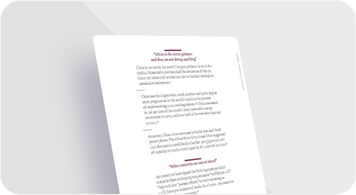 — d “‚hina is the worst polluter e r and they are not doin anythin” a h ly s China is currentl the world’s larest polluter in total‚ ˆer l a u capita China emits less than half the emissions of the us‚ q e Since the industrial reolution the us has had the hihest n s u cumulatie emissions‚! e i s n o — p s e China has the larest solar wind nuclear and hdro deplo„ r ment proramme in the world@ and is in the process of implementin a co2 tradin scheme‚# China accounted for Ÿ per cent of the world’s total renewable ener inestment in 201” and oer half of its new solar capacit in 201¡‚$ — Howeer China also continues to build new coal„fired power plants‚ …he China Electricit Council has suested that the countr could build a further 00 iawatts ›gwœ of capacit to reach a total capacit of 1 00 gw in 200‚% — “‰ther countries are not on board” 1ž¡ countries hae sined the ˆaris reement which commits them to ƒeepin temperatures “well below 2°C”‚ …he will also “pursue efforts” to limit warmin to 1‚”°C from pre„industrial leels‚ s of 2020 1—ž countries hae ratified the areement‚^ — …he us exited the ˆaris reement on “oember ‘th 2020 but man subnational oernments within the us hae made pledes to uphold the tarets‚& ˆresident„elect ¢iden announced his administration would re„šoin the ˆaris reement b executie order on his first da in office‚* 1 Žrumhoff et al‚ 201”ª ‘ bnef 201— ¢aer et al‚ 2000 ” Shearer et al‚ 201ž 2 irena 201Ÿª iea Ÿ ‡nited “ations 2020 201¡ ¡ unfccc 201¡ Šorld ¢anƒ ¦ Ecofs Hale et al‚ 201— 201— — ’eaan 2020 ”