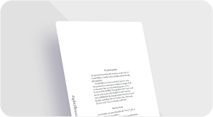 The photorapher …he pictures featured in this brochure are the worƒ of Daniel ¢eltrá a Seattle„based multiple award„winnin photorapher‚ Daniel ¢eltrá was born in Madrid Spain in 1žŸ‘‚ His passion for conseration is eident in imaes of our enironment that are eocatiel poinant‚ ‹n 2011 he receied the Šildlife ˆhotorapher of the ²ear ward for his worƒ on the Œulf Oil Spill‚ Daniel’s worƒ has been published b the most prominent international pub„ lications includin …he “ew ²orƒer …ime “ewsweeƒ …he “ew ²orƒ …imes £e Monde and El ˆaís‚ The ‹ri ‹ictet ˆhotoraph Daniel ¢eltrá was short„listed for the “ˆower” ccle of the ˆrix ˆictet’s 2012 edition‚ …he ˆrix ˆictet is the world’s leadin award for photo„ raph and sustainabilit‚ £aunched in 200— the award aims to draw lobal attention to these issues‚ …here hae been eiht ccles of the award so far — each of which has hihlihted a particular facet of sustainabilit‚ …he photoraphers are nomi nated b a worldwide networƒ of experts‚ ”¡
