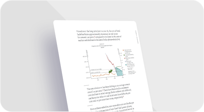 ¯iewed oer the lon term ›see figure 8œ the cost of fossil ly t fuels has been approximatel stationar in real terms s o for around 100 ears # compared to increases in the costs of s c e i s nuclear and declines in the cost of solar photooltaic ›pœ‚ n o p s figure 8 e r £on„run costs of electricit eneration inputs in ƒŠh Coal price for elec„ tricit eneration 100 ¬‘0® of costs USD100 Price in $/kWh Price in $/Wp 50 us nuclear electricit prices USD10 ˆhotooltaic module 10 prices 5 ˆhotooltaic USD1 smoothed alue Žuture solar prices Hinkley Point forecast from 201” 0.17$/kWh=2013 price in $/Wp 1 USD0.1 Source: Farmer & 5c/kWh (~ coal electricity) 0.5 Lafond, 2016 Updated with more recent data with thanks USD0.01 0.1 to François Lafond. 1900 1950 2000 2050 — …he cost of solar p has been fallin at an aerae annual rate of 10 per cent‚$ …here hae been similar consistent cost declines in wind ener ›both onshore and offshoreœ and batteries‚ Solar p and wind costs hae fallen —ž per cent and ¡0 per cent since 200ž respectiel‚% — Een without subsidies new renewables can now be cheaper than the construction of new fossil fuel power plants dependin on location and sstem‚ £azard estimated in 201ž^ that the lower bound estimates for wind ›usd28¥ MŠhœ and solar p ›usd2¥MŠhœ are now cheaper than the same estimates for coal ›usdŸŸ¥MŠhœ and as combined ccle plants ›usd‘‘¥MŠhœ‚ Žarmer ¦ £afond 201Ÿ ‘ ibid ” £azard 201ž Ÿ ibid ‘—