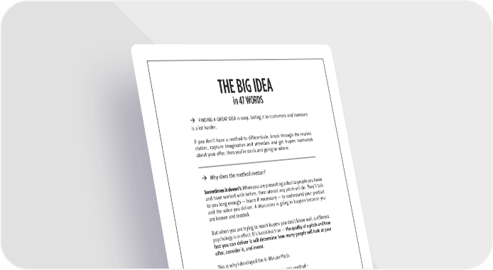 THE BIG IDEA in 47 WORDS b FINDING A GREAT IDEA is easy. Selling it to customers and investors is a lot harder. If you don’t have a method to differentiate, break through the market clutter, capture imagination and attention and get buyers motivated about your offer, then you’re stuck and going no where. b Why does the method matter? Sometimes it doesn’t. When you are presenting a deal to people you know and have worked with before, then almost any pitch will do. They’ll talk to you long enough — hours if necessary — to understand your product and the value you deliver. A discussion is going to happen because you are known and trusted. But when you are trying to reach buyers you don’t know well, a different psychology is in effect. It’s harsh but true — the quality of a pitch and how fast you can deliver it will determine how many people will look at your offer, consider it, and invest. This is why I developed the 6-Minute Pitch. Hope you invest a few minutes to learn this method - the potential pay off is huge. Oren Klaff Pitch Anything Blueprint 3
