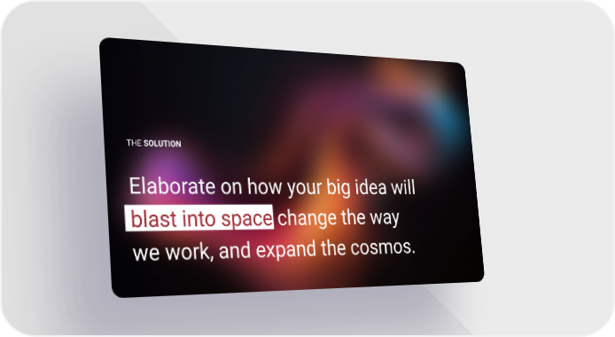 Pitchdeck Template - PowerPoint, Google Slides Page 10 Page 12THE SOLUTION Elaborate on how your big idea will blast into space change the way we work, and expand the cosmos.