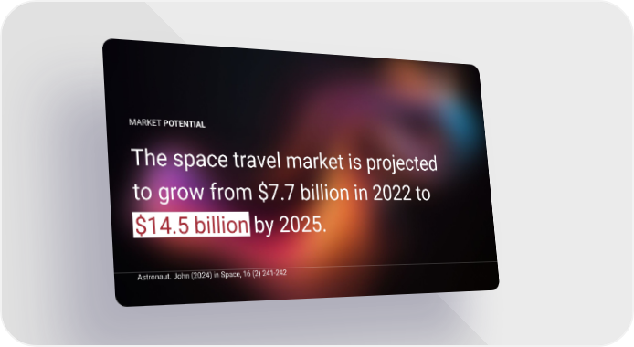 Pitchdeck Template - PowerPoint, Google Slides Page 13 Page 15MARKET POTENTIAL The space travel market is projected to grow from $7.7 billion in 2022 to $14.5 billion by 2025. Astronaut. John (2024) in Space, 16 (2) 241-242