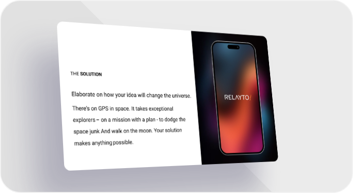 THE SOLUTION Elaborate on how your idea will change the universe. There's on GPS in space. It takes exceptional explorers – on a mission with a plan - to dodge the space junk. And walk on the moon. Your solution makes anything possible.