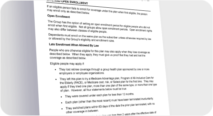 applying for coverage through the PEBB Program. Premera Blue Cross determines eligibility for an applicant applying for coverage as a state resident. The benefits available under this Medicare Supplement plan described in this certificate of coverage are the same whether you enroll through the PEBB Program or enroll as a state resident, however, other provisions in this certificate may not apply or may be different for those that enroll through the PEBB Program as PEBB Program rules will apply. LATE AND OPEN ENROLLMENT If an eligible person fails to enroll for coverage under this plan when first eligible, the person may enroll only as described below. Open Enrollment The Group has the option of setting an open enrollment period for eligible people who did not enroll when first eligible. Not all groups allow open enrollment periods. Open enrollment rights may also differ between classes of eligible people. Dependents must enroll on the same plan as the subscriber unless otherwise required by law or allowed by the Group's eligibility and enrollment rules. Late Enrollment When Allowed By Law People who are otherwise eligible for this plan may also apply when they lose coverage as described below. When they apply, they must give us proof that they had and lost the coverage as described below. Eligible people may apply if: • They lost retiree coverage through a group health plan sponsored by one or more employers or employee organizations. • They left this plan to try a Medicare Advantage plan, Program of All-Inclusive Care for the Elderly (PACE), or Medicare cost, risk, or Select plan for the first time. They may apply if they tried one plan, more than one plan of the same type, or more than one type of plan. However, all four statements below must be true: • They were covered under each plan for less than 12 months. • Each plan (other than the most recent) must have been terminated involuntarily. • They switched plans within 63 days of the date the prior plan terminated, with no other coverage in between. • The effective date of the last plan was less than 2 years after the effective date of the first plan. • At age 65 and upon first becoming eligible for Medicare Part A, they enrolled in one or more Medicare Advantage or PACE plans. All four statements above must also be true. 5 Group Plan G/Age