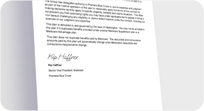 ABOUT THIS PLAN The benefits, limitations, exclusions and other provisions in this booklet are subject to the terms of Premera Blue Cross's contract with the Group named on its Face Page. This booklet is a part of that contract. It replaces any other group Medicare supplement certificate you may have received. This certificate of coverage is an important document and should be kept in a safe place. The Group has delegated authority to Premera Blue Cross to use its expertise and judgment as part of the routine operation of the plan to reasonably apply the terms of the contract for making decisions as they apply to specific eligibility, benefits and claims situations. This does not prevent you from exercising rights you may have under applicable law to appeal or bring a civil lawsuit challenging any eligibility or claims determinations under the contract, including our exercise of our judgment and expertise. This plan is delivered in and governed by the laws of Washington. You may not be enrolled in this plan if it duplicates benefits provided under another Medicare Supplement plan or a Medicare Advantage plan. This plan does not duplicate benefits paid by Medicare. The deductible and coinsurance amounts paid by this plan will automatically change when Medicare’s deductible and coinsurance requirements change. Kip Haffner Senior Vice President, Medicare Premera Blue Cross