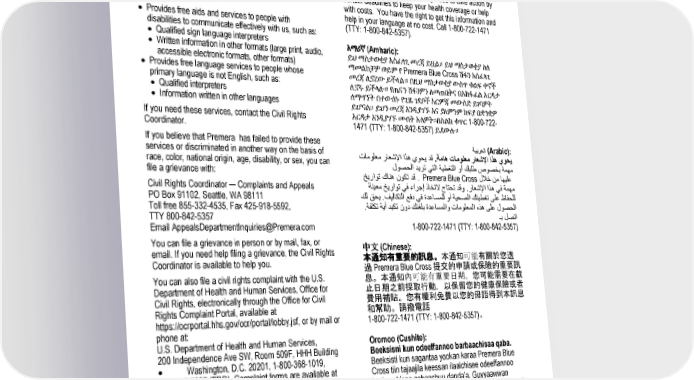 Discrimination is Against the Law Getting Help in Other Languages Premera Blue Cross complies with applicable Federal civil rights laws and does not discriminate on the basis of This Notice has Important Information. This notice may race, color, national origin, age, disability, or have important information about your application or sex. Premera does not exclude people or treat them coverage through Premera Blue Cross. There may be differently because of race, color, national origin, age, key dates in this notice. You may need to take action by disability or sex. certain deadlines to keep your health coverage or help Premera: with costs. You have the right to get this information and • Provides free aids and services to people with help in your language at no cost. Call 1-800-722-1471 disabilities to communicate effectively with us, such as: (TTY: 1-800-842-5357). • Qualified sign language interpreters • Written information in other formats (large print, audio, አማሪኛ (Amharic): accessible electronic formats, other formats) ይህ ማስታወቂያ አስፈላጊ መረጃ ይዟል። ይህ ማስታወቂያ ስለ • Provides free language services to people whose ማመልከቻዎ ወይም የ Premera Blue Cross ሽፋን አስፈላጊ primary language is not English, such as: መረጃ ሊኖረው ይችላል። በዚህ ማስታወቂያ ውስጥ ቁልፍ ቀኖች • Qualified interpreters ሊኖሩ ይችላሉ። የጤናን ሽፋንዎን ለመጠበቅና በአከፋፈል እርዳታ • Information written in other languages ለማግኘት በተውሰኑ የጊዜ ገደቦች እርምጃ መውሰድ ይገባዎት ይሆናል። ይህን መረጃ እንዲያገኙ እና ያለምንም ክፍያ በቋንቋዎ እርዳታ እንዲያገኙ መብት አለዎት።በስልክ ቁጥር 1-800-722- If you need these services, contact the Civil Rights 1471 (TTY: 1-800-842-5357) ይደውሉ። Coordinator. If you believe that Premera has failed to provide these ةيبرعلا (Arabic): services or discriminated in another way on the basis of تامولعم راعشلإا اذه يوحي دق .ةماه تامولعم راعشلإا اذه يوحي race, color, national origin, age, disability, or sex, you can لوصحلا ديرت يتلا ةيطغتلا وأ كبلط صوصخب ةمهم file a grievance with: خيراوت كانه نوكت دق . Premera Blue Cross للاخ نم اهيلع Civil Rights Coordinator ─ Complaints and Appeals ةنيعم خيراوت يف ءارجإ ذا ختلا جاتحت دق و .راعشلإا اذه يف ةمهم PO Box 91102, Seattle, WA 98111 كل قحي .فيلاكتلا عفد يف ةدعاسملل وأ ةيحصلا كتيطغت ىلع ظافحلل Toll free 855-332-4535, Fax 425-918-5592, .ةفلكت ةيأ دب كت نود كتغلب ةدعاسملاو تامولعملا هذه ىلع لوصحلا TTY 800-842-5357 ـب لصتا Email AppealsDepartmentInquiries@Premera.com 1-800-722-1471 (TTY: 1-800-842-5357) You can file a grievance in person or by mail, fax, or 中文 (Chinese): email. If you need help filing a grievance, the Civil Rights Coordinator is available to help you. 本通知有重要的訊息。本通知可能有關於您透 過 Premera Blue Cross 提交的申請或保險的重要訊 You can also file a civil rights complaint with the U.S. 息。本通知內可能有重要日期。您可能需要在截 Department of Health and Human Services, Office for 止日期之前採取行動,以保留您的健康保險或者 Civil Rights, electronically through the Office for Civil 費用補貼。您有權利免費以您的母語得到本訊息 Rights Complaint Portal, available at 和幫助。請撥電話 https://ocrportal.hhs.gov/ocr/portal/lobby.jsf, or by mail or 1-800-722-1471 (TTY: 1-800-842-5357)。 phone at: U.S. Department of Health and Human Services, Oromoo (Cushite): 200 Independence Ave SW, Room 509F, HHH Building • Washington, D.C. 20201, 1-800-368-1019, Beeksisni kun odeeffannoo barbaachisaa qaba. Beeksisti kun sagantaa yookan karaa Premera Blue 800-537-7697 (TDD). Complaint forms are available at http://www.hhs.gov/ocr/office/file/index.html. Cross tiin tajaajila keessan ilaalchisee odeeffannoo barbaachisaa qabaachuu danda’a. Guyyaawwan murteessaa ta’an beeksisa kana keessatti ilaalaa. Tarii kaffaltiidhaan deeggaramuuf yookan tajaajila fayyaa keessaniif guyyaa dhumaa irratti wanti raawwattan jiraachuu danda’a. Kaffaltii irraa bilisa haala ta’een afaan keessaniin odeeffannoo argachuu fi deeggarsa argachuuf mirga ni qabaattu. Lakkoofsa bilbilaa 1-800-722-1471 (TTY: 1-800-842-5357) tii bilbilaa.
