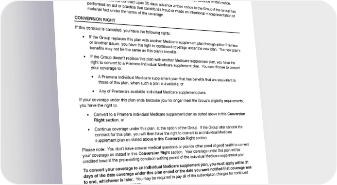 Contract Cancellation The contract for this plan will be canceled automatically if subscription charges aren’t paid by the Group by the end of the Grace Period. Coverage will end on the last day for which payment was made. The contract may also be canceled as explained below. • The Group may cancel the contract at any time by giving us 30 days advance written notice. • We may cancel the contract upon 30 days advance written notice to the Group if the Group has performed an act or practice that constitutes fraud or made an intentional misrepresentation of material fact under the terms of the coverage CONVERSION RIGHT If this contract is canceled, you have the following rights: • If the Group replaces this plan with another Medicare supplement plan through either Premera or another issuer, you have the right to continued coverage under the new plan. The new plan's benefits may not be the same as this plan's benefits. • If the Group doesn't replace this plan with another Medicare supplement plan, you have the right to convert to a Premera individual Medicare supplement plan. You can choose to convert your coverage to: • A Premera individual Medicare supplement plan that has benefits that are equivalent to those of this plan, when such a plan is available; or • Any of Premera's available individual Medicare supplement plans. If your coverage under this plan ends because you no longer meet the Group's eligibility requirements, you have the right to: • Convert to a Premera individual Medicare supplement plan as stated above in this Conversion Right section; or • Continue coverage under this plan, at the option of the Group. If the Group later cancels the contract for this plan, you will then have the right to convert to an individual Medicare supplement plan as stated above in this Conversion Right section. Please note: You don't have answer medical questions or provide other proof of good health to convert your coverage as stated in this Conversion Right section. Your coverage under this plan will be credited toward the pre-existing condition waiting period of the individual Medicare supplement plan. To convert your coverage to an individual Medicare supplement plan, you must apply within 31 days of the date coverage under this plan ended or the date you were notified that coverage was to end, whichever is later. You may be required to pay all of the subscription charges for continued Medicare supplement coverage. EXTENDED BENEFITS FOR TOTAL DISABILITY If you are “totally disabled” when your coverage ends for any reason other than material misrepresentation on your application, benefits can be continued as described below. "Totally disabled" 8 Group Plan G/Age