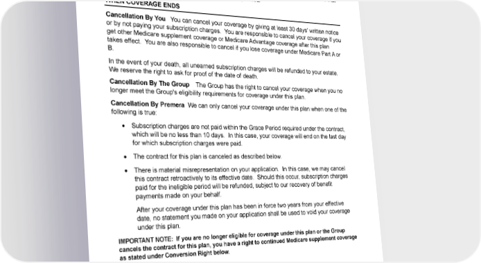 When you lose entitlement to Medicaid, your request to reinstitute coverage under this plan must be received by us within 90 days of the date Medicaid entitlement ends. Upon receipt, your coverage will restart on the first day on which Medicaid is no longer available. You must also pay subscription charges starting on the date your coverage is once more in force. Your subscription charges will be determined on terms at least as favorable to you as the terms that would have applied had your coverage not been suspended. WHEN COVERAGE ENDS Cancellation By You You can cancel your coverage by giving at least 30 days' written notice or by not paying your subscription charges. You are responsible to cancel your coverage if you get other Medicare supplement coverage or Medicare Advantage coverage after this plan takes effect. You are also responsible to cancel if you lose coverage under Medicare Part A or B. In the event of your death, all unearned subscription charges will be refunded to your estate. We reserve the right to ask for proof of the date of death. Cancellation By The Group The Group has the right to cancel your coverage when you no longer meet the Group's eligibility requirements for coverage under this plan. Cancellation By Premera We can only cancel your coverage under this plan when one of the following is true: • Subscription charges are not paid within the Grace Period required under the contract, which will be no less than 10 days. In this case, your coverage will end on the last day for which subscription charges were paid. • The contract for this plan is canceled as described below. • There is material misrepresentation on your application. In this case, we may cancel this contract retroactively to its effective date. Should this occur, subscription charges paid for the ineligible period will be refunded, subject to our recovery of benefit payments made on your behalf. After your coverage under this plan has been in force two years from your effective date, no statement you made on your application shall be used to void your coverage under this plan. IMPORTANT NOTE: If you are no longer eligible for coverage under this plan or the Group cancels the contract for this plan, you have a right to continued Medicare supplement coverage as stated under Conversion Right below. 8 Group Plan G/Dis