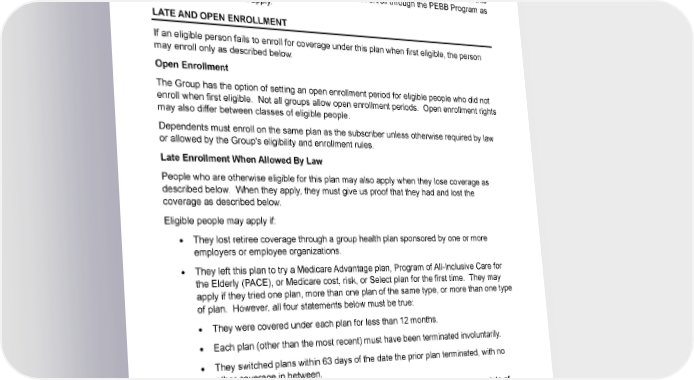 Benefits Board (PEBB) Program. The PEBB Program determines eligibility for an applicant applying for coverage through the PEBB Program. Premera Blue Cross determines eligibility for an applicant applying for coverage as a state resident. The benefits available under this Medicare Supplement plan described in this certificate of coverage are the same whether you enroll through the PEBB Program or enroll as a state resident, however, other provisions in this certificate may not apply or may be different for those that enroll through the PEBB Program as PEBB Program rules will apply. LATE AND OPEN ENROLLMENT If an eligible person fails to enroll for coverage under this plan when first eligible, the person may enroll only as described below. Open Enrollment The Group has the option of setting an open enrollment period for eligible people who did not enroll when first eligible. Not all groups allow open enrollment periods. Open enrollment rights may also differ between classes of eligible people. Dependents must enroll on the same plan as the subscriber unless otherwise required by law or allowed by the Group's eligibility and enrollment rules. Late Enrollment When Allowed By Law People who are otherwise eligible for this plan may also apply when they lose coverage as described below. When they apply, they must give us proof that they had and lost the coverage as described below. Eligible people may apply if: • They lost retiree coverage through a group health plan sponsored by one or more employers or employee organizations. • They left this plan to try a Medicare Advantage plan, Program of All-Inclusive Care for the Elderly (PACE), or Medicare cost, risk, or Select plan for the first time. They may apply if they tried one plan, more than one plan of the same type, or more than one type of plan. However, all four statements below must be true: • They were covered under each plan for less than 12 months. • Each plan (other than the most recent) must have been terminated involuntarily. • They switched plans within 63 days of the date the prior plan terminated, with no other coverage in between. • The effective date of the last plan was less than 2 years after the effective date of the first plan. • At age 65 and upon first becoming eligible for Medicare Part A, they enrolled in one or more Medicare Advantage or PACE plans. All four statements above must also be true. 6 Group Plan G/Dis