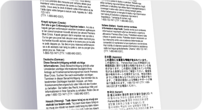Iloko (Ilocano): Daytoy a Pakdaar ket naglaon iti Napateg nga Impormasion. Daytoy a pakdaar mabalin Français (French): nga adda ket naglaon iti napateg nga impormasion Cet avis a d'importantes informations. Cet avis peut maipanggep iti apliksayonyo wenno coverage babaen iti avoir d'importantes informations sur votre demande ou la Premera Blue Cross. Daytoy ket mabalin dagiti couverture par l'intermédiaire de Premera Blue Cross. Le importante a petsa iti daytoy a pakdaar. Mabalin nga présent avis peut contenir des dates clés. Vous devrez adda rumbeng nga aramidenyo nga addang sakbay dagiti peut-être prendre des mesures par certains délais pour partikular a naituding nga aldaw tapno mapagtalinaedyo ti maintenir votre couverture de santé ou d'aide avec les coverage ti salun-atyo wenno tulong kadagiti gastos. coûts. Vous avez le droit d'obtenir cette information et de Adda karbenganyo a mangala iti daytoy nga impormasion l’aide dans votre langue à aucun coût. Appelez le 1-800- ken tulong iti bukodyo a pagsasao nga awan ti 722-1471 bayadanyo. Tumawag iti numero nga (TTY: 1-800-842-5357). 1-800-722-1471 (TTY: 1-800-842-5357). Kreyòl ayisyen (Creole): Italiano (Italian): Questo avviso contiene Avi sila a gen Enfòmasyon Enpòtan ladann. Avi sila a informazioni importanti. Questo avviso può contenere kapab genyen enfòmasyon enpòtan konsènan aplikasyon informazioni importanti sulla tua domanda o copertura w lan oswa konsènan kouvèti asirans lan atravè Premera attraverso Premera Blue Cross. Potrebbero esserci date Blue Cross. Kapab genyen dat ki enpòtan nan avi sila a. chiave in questo avviso. Potrebbe essere necessario un Ou ka gen pou pran kèk aksyon avan sèten dat limit pou tuo intervento entro una scadenza determinata per ka kenbe kouvèti asirans sante w la oswa pou yo ka ede consentirti di mantenere la tua copertura o sovvenzione. w avèk depans yo. Se dwa w pou resevwa enfòmasyon Hai il diritto di ottenere queste informazioni e assistenza sa a ak asistans nan lang ou pale a, san ou pa gen pou nella tua lingua gratuitamente. Chiama 1-800-722-1471 peye pou sa. Rele nan (TTY: 1-800-842-5357). 1-800-722-1471 (TTY: 1-800-842-5357). 日本語 (Japanese): Deutsche (German): この通知には重要な情報が含まれています。 Diese Benachrichtigung enthält wichtige この通知には、 Premera Blue Cross の申請または Informationen. Diese Benachrichtigung enthält unter 補償範囲に関する重要な情報が含まれている場 Umständen wichtige Informationen bezüglich Ihres 合があります。この通知に記載されている可能 Antrags auf Krankenversicherungsschutz durch Premera 性がある重要な日付をご確認ください。健康保 Blue Cross. Suchen Sie nach eventuellen wichtigen 険や有料サポートを維持するには、特定の期日 Terminen in dieser Benachrichtigung. Sie könnten bis zu までに行動を取らなければならない場合があり bestimmten Stichtagen handeln müssen, um Ihren ます。ご希望の言語による情報とサポートが無 Krankenversicherungsschutz oder Hilfe mit den Kosten 料で提供されます。1-800-722-1471 (TTY: 1-800- zu behalten. Sie haben das Recht, kostenlose Hilfe und 842-5357)までお電話ください。 Informationen in Ihrer Sprache zu erhalten. Rufen Sie an unter 1-800-722-1471 (TTY: 1-800-842-5357). 한국어 (Korean): 본 통지서에는 중요한 정보가 들어 있습니다. 즉 Hmoob (Hmong): Tsab ntawv tshaj xo no muaj cov 이 통지서는 귀하의 신청에 관하여 그리고 ntshiab lus tseem ceeb. Tej zaum tsab ntawv tshaj xo Premera Blue Cross 를 통한 커버리지에 관한 no muaj cov ntsiab lus tseem ceeb txog koj daim ntawv 정보를 포함하고 있을 수 있습니다. 본 thov kev pab los yog koj qhov kev pab cuam los ntawm 통지서에는 핵심이 되는 날짜들이 있을 수 Premera Blue Cross. Tej zaum muaj cov hnub tseem 있습니다. 귀하는 귀하의 건강 커버리지를 계속 ceeb uas sau rau hauv daim ntawv no. Tej zaum koj kuj 유지하거나 비용을 절감하기 위해서 일정한 yuav tau ua qee yam uas peb kom koj ua tsis pub dhau 마감일까지 조치를 취해야 할 필요가 있을 수 cov caij nyoog uas teev tseg rau hauv daim ntawv no 있습니다. 귀하는 이러한 정보와 도움을 귀하의 mas koj thiaj yuav tau txais kev pab cuam kho mob los 언어로 비용 부담없이 얻을 수 있는 권리가 yog kev pab them tej nqi kho mob ntawd. Koj muaj cai 있습니다. 1-800-722-1471 kom lawv muab cov ntshiab lus no uas tau muab sau ua (TTY: 1-800-842-5357) 로 전화하십시오. koj hom lus pub dawb rau koj. Hu rau 1-800-722-1471 (TTY: 1-800-842-5357).