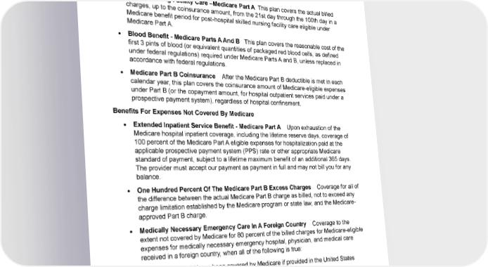 • Lifetime Inpatient Reserve Days - Medicare Part A This plan covers Part A Medicare-eligible expenses incurred for hospitalization to the extent not covered by Medicare for each Medicare lifetime inpatient reserve day used. • Hospice and Respite Care – Medicare Part A This plan covers cost-sharing for all Part A Medicare-eligible hospice care and respite care expenses. • Skilled Nursing Facility Care –Medicare Part A This plan covers the actual billed charges, up to the coinsurance amount, from the 21st day through the 100th day in a Medicare benefit period for post-hospital skilled nursing facility care eligible under Medicare Part A. • Blood Benefit - Medicare Parts A And B This plan covers the reasonable cost of the first 3 pints of blood (or equivalent quantities of packaged red blood cells, as defined under federal regulations) required under Medicare Parts A and B, unless replaced in accordance with federal regulations. • Medicare Part B Coinsurance After the Medicare Part B deductible is met in each calendar year, this plan covers the coinsurance amount of Medicare-eligible expenses under Part B (or the copayment amount, for hospital outpatient services paid under a prospective payment system), regardless of hospital confinement. Benefits For Expenses Not Covered By Medicare • Extended Inpatient Service Benefit - Medicare Part A Upon exhaustion of the Medicare hospital inpatient coverage, including the lifetime reserve days, coverage of 100 percent of the Medicare Part A eligible expenses for hospitalization paid at the applicable prospective payment system (PPS) rate or other appropriate Medicare standard of payment, subject to a lifetime maximum benefit of an additional 365 days. The provider must accept our payment as payment in full and may not bill you for any balance. • One Hundred Percent Of The Medicare Part B Excess Charges Coverage for all of the difference between the actual Medicare Part B charge as billed, not to exceed any charge limitation established by the Medicare program or state law, and the Medicare- approved Part B charge. • Medically Necessary Emergency Care In A Foreign Country Coverage to the extent not covered by Medicare for 80 percent of the billed charges for Medicare-eligible expenses for medically necessary emergency hospital, physician, and medical care received in a foreign country, when all of the following is true: • The care would have been covered by Medicare if provided in the United States • The care began during the first 60 consecutive days of each trip outside the United States This benefit is subject to a separate calendar year deductible of $250 and a lifetime maximum benefit of $50,000. For purposes of this benefit, "emergency care" shall 4 Group Plan G/Dis