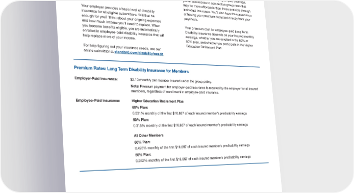 Rates Evaluate What Makes Sense For You. How Much Your Coverage Costs Getting by without a paycheck isn’t easy, especially Your employer-paid Long Term Disability insurance for an extended period of time. Make sure you have costs you nothing. With employee-paid coverage, enough 昀椀nancial protection to help you with housing you’ll have access to competitive group rates that costs, utilities and other bills. may be more affordable than those available through individual insurance. You’ll also have the convenience Your employer provides a basic level of disability of having your premium deducted directly from your insurance for all eligible subscribers. Will that be paycheck. enough for you? Think about your ongoing expenses and how much income you’ll need to replace. When Your premium cost for employee-paid Long Term you become bene昀椀ts eligible, you are automatically Disability insurance depends on your insured monthly enrolled in employee-paid disability insurance that will earnings, whether you are enrolled in the 60% or help replace more of your income. 50% plan, and whether you participate in the Higher Education Retirement Plan. For help 昀椀guring out your insurance needs, use our online calculator at standard.com/disability/needs. Premium Rates: Long Term Disability Insurance for Members Employer-Paid Insurance: $2.10 monthly per member insured under the group policy. Note: Premium payment for employer-paid insurance is required by the employer for all insured members, regardless of enrollment in employee-paid insurance. Employee-Paid Insurance: Higher Education Retirement Plan 60% Plan: 0.531% monthly of the 昀椀rst $16,667 of each insured member’s predisability earnings 50% Plan: 0.315% monthly of the 昀椀rst $16,667 of each insured member’s predisability earnings All Other Members 60% Plan: 0.423% monthly of the 昀椀rst $16,667 of each insured member’s predisability earnings 50% Plan: 0.252% monthly of the 昀椀rst $16,667 of each insured member’s predisability earnings The Standard 4 Group Buy-Up Long Term Disability Insurance