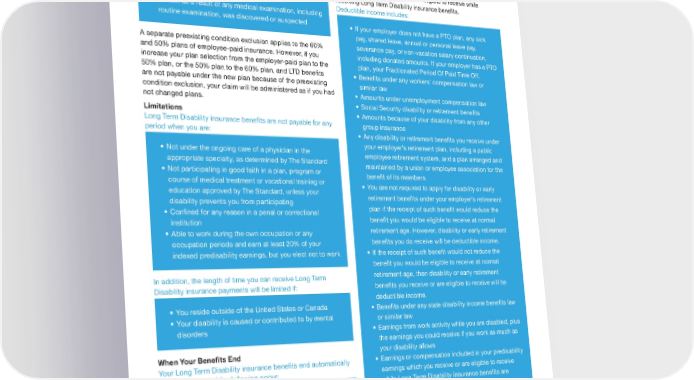 Preexisting Condition Provision A preexisting condition is a mental or physical condition whether • You fail to provide proof of continued disability and or not diagnosed or misdiagnosed during the 90-day period just entitlement to bene昀椀ts before your Long Term Disability insurance becomes effective: • You pass away • For which you have consulted a physician or other licensed medical professional; received medical Deductible Income treatment, services or advice; undergone diagnostic Your bene昀椀ts will be reduced if you have deductible income, procedures, including self-administered procedures; or which is income you receive or are eligible to receive while taken prescribed drugs or medications receiving Long Term Disability insurance bene昀椀ts. Deductible income includes: • Which, as a result of any medical examination, including routine examination, was discovered or suspected • If your employer does not have a PTO plan, any sick pay, shared leave, annual or personal leave pay, A separate preexisting condition exclusion applies to the 60% severance pay, or non-vacation salary continuation, and 50% plans of employee-paid insurance. However, if you including donated amounts. If your employer has a PTO increase your plan selection from the employer-paid plan to the plan, your Fractionated Period Of Paid Time Off. 50% plan, or the 50% plan to the 60% plan, and LTD bene昀椀ts • Bene昀椀ts under any workers’ compensation law or are not payable under the new plan because of the preexisting similar law condition exclusion, your claim will be administered as if you had • Amounts under unemployment compensation law not changed plans. • Social Security disability or retirement bene昀椀ts Limitations • Amounts because of your disability from any other Long Term Disability insurance bene昀椀ts are not payable for any group insurance period when you are: • Any disability or retirement bene昀椀ts you receive under your employer’s retirement plan, including a public • Not under the ongoing care of a physician in the employee retirement system, and a plan arranged and appropriate specialty, as determined by The Standard maintained by a union or employee association for the • Not participating in good faith in a plan, program or bene昀椀t of its members course of medical treatment or vocational training or • You are not required to apply for disability or early education approved by The Standard, unless your retirement bene昀椀ts under your employer’s retirement disability prevents you from participating • Con昀椀ned for any reason in a penal or correctional plan if the receipt of such bene昀椀t would reduce the institution bene昀椀t you would be eligible to receive at normal • Able to work during the own occupation or any retirement age. However, disability or early retirement occupation periods and earn at least 20% of your bene昀椀ts you do receive will be deductible income. indexed predisability earnings, but you elect not to work • If the receipt of such bene昀椀t would not reduce the bene昀椀t you would be eligible to receive at normal In addition, the length of time you can receive Long Term retirement age, then disability or early retirement Disability insurance payments will be limited if: bene昀椀ts you receive or are eligible to receive will be deductible income. • You reside outside of the United States or Canada • Bene昀椀ts under any state disability income bene昀椀ts law • Your disability is caused or contributed to by mental or similar law disorders • Earnings from work activity while you are disabled, plus the earnings you could receive if you work as much as When Your Bene昀椀ts End your disability allows Your Long Term Disability insurance bene昀椀ts end automatically • Earnings or compensation included in your predisability on the date any of the following occur: earnings which you receive or are eligible to receive while Long Term Disability insurance bene昀椀ts are • You are no longer disabled payable • Your maximum bene昀椀t period ends • Amounts due from or on behalf of a third party because • Bene昀椀ts become payable under any other disability of your disability, whether by judgment, settlement or insurance plan under which you become insured other method through employment during a period of temporary • Any amount you receive by compromise, settlement or recovery other method as a result of a claim for any of the above Continued on next column The Standard 6 Group Buy-Up Long Term Disability Insurance