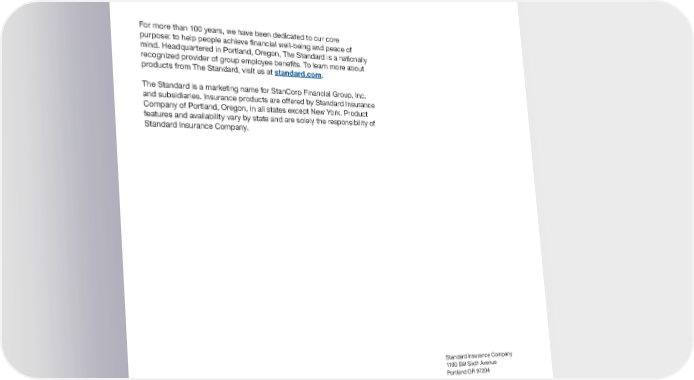 For more than 100 years, we have been dedicated to our core purpose: to help people achieve 昀椀nancial well-being and peace of mind. Headquartered in Portland, Oregon, The Standard is a nationally recognized provider of group employee bene昀椀ts. To learn more about products from The Standard, visit us at standard.com. The Standard is a marketing name for StanCorp Financial Group, Inc. and subsidiaries. Insurance products are offered by Standard Insurance Company of Portland, Oregon, in all states except New York. Product features and availability vary by state and are solely the responsibility of Standard Insurance Company. Standard Insurance Company 1100 SW Sixth Avenue Portland OR 97204 GP190-LTD/S399, GP399-LTD/TRUST, GP899-LTD, Contract 2000 377661-B SI 20354 (8/24) The Standard 8 Group Buy-Up Long Term Disability Insurance