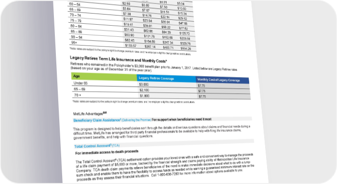 1 Monthly Costs for Retiree Term Life Insurance Listed below are your monthly rates (based on your age as of December 31 of the year prior). Age Monthly Monthly Monthly Monthly Cost Cost Cost Cost $5,000 $10,000 $15,000 $20,000 Under 49 $0.87 $1.74 $2.61 $3.48 50 – 54 $1.34 $2.67 $4.01 $5.34 55 – 59 $2.50 $5.00 $7.50 $10.00 60 – 64 $3.84 $7.67 $11.51 $15.34 65 – 69 $7.38 $14.76 $22.14 $29.52 70 – 74 $11.97 $23.94 $35.91 $47.88 75 – 79 $19.41 $38.81 $58.22 $77.62 80 – 84 $31.43 $62.86 $94.29 $125.72 85 – 89 $50.90 $101.79 $152.69 $203.58 90 – 94 $82.45 $164.89 $247.34 $329.78 95+ $133.57 $267.14 $400.71 $534.28 *Note: rates are subject to the policy’s right to change premium rates, and the employer’s right to change retiree contributions. Legacy Retiree Term Life Insurance and Monthly Costs* Retirees who remained in the Policyholder’s $3,000 benefit plan prior to January 1, 2017. Listed below are Legacy Retiree rates (based on your age as of December 31 of the year prior). Age Legacy Retiree Coverage Monthly Cost of Legacy Coverage Under 65 $3,000 $7.75 65 – 69 $2,100 $7.75 70 + $1,800 $7.75 *Note: rates are subject to the policy’s right to change premium rates, and the employer’s right to change retiree contributions. SM MetLife Advantages 2 Beneficiary Claim Assistance (Delivering the Promise) For support when beneficiaries need it most This program is designed to help beneficiaries sort through the details and serious questions about claims and financial needs during a difficult time. MetLife has arranged for third party financial professionals to be available to help with filing life insurance claims, government benefits, and help with financial questions. 3 Total Control Account (TCA) For immediate access to death proceeds ® The Total Control Account (TCA) settlement option provides your loved ones with a safe and convenient way to manage the proceeds of a life claim payment of $5,000 or more, backed by the financial strength and claims paying ability of Metropolitan Life Insurance Company. TCA death claim payments relieve beneficiaries of the need to make immediate decisions about what to do with a lump- sum check and enable them to have the flexibility to access funds as needed while earning a guaranteed minimum interest rate on the proceeds as they assess their financial situations. Call 1-800-638-7283 for more information about options available to you. Metropolitan Life Insurance Company | 200 Park Avenue | New York, NY 10166 L0823034637[exp0825][All States][DC,GU,MP,PR,VI]© 2023 MetLife Services and Solutions, LLC