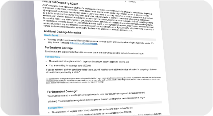 Standard Additional Benefits Include Some of the standard additional benefits included in your AD&D coverage that may increase the amounts payable to you and/or cover additional expenses that result from accidental injury or loss of life are: • Air Bag • Child Care Center • Hospitalization • Seat Belt • Child Education • Presumption of Death • Common Carrier • Spouse Education • Exposure What Is Not Covered by AD&D? AD&D insurance does not include payment for any loss which is caused by or contributed to by: physical or mental illness, diagnosis of or treatment of the illness; an infection, unless caused by an external wound accidentally sustained; suicide or attempted suicide; injuring oneself on purpose; the voluntary intake or use by any means of any drug, medication or sedative, unless taken as prescribed by a doctor or an over-the-counter drug taken as directed; voluntary intake of alcohol in combination with any drug, medication or sedative; war, whether declared or undeclared, or act of war, insurrection, rebellion or active participation in a riot; committing or trying to commit a felony; any poison, fumes or gas, voluntarily taken, administered or absorbed; service in the armed forces of any country or international authority, except the United States National Guard; operating, learning to operate, or serving as a member of a crew of an aircraft; while in any aircraft for the purpose of descent from such aircraft while in flight (except for self-preservation); or operating a vehicle or device while intoxicated as defined by the laws of the jurisdiction in which the accident occurs. Additional Coverage Information How to Enroll • You may enroll in supplemental life and AD&D insurance coverage quickly and securely online using the MyBenefits website. It’s easy to use. Just go to mybenefits.metlife.com/wapebb. For Employee Coverage Enrollment in this Supplemental Term Life insurance plan is available without providing medical information as long as: For New Hires • The enrollment takes place within 31 days from the date you become eligible for benefits, and • You are enrolling for coverage up to $500,000. If you do not meet all of the conditions stated above, you will need to provide additional medical information by completing a Statement of Health form provided by MetLife.* *All applications for coverage are subject to review and approval by MetLife. If you choose to apply for increased coverage, the increase may be subject to underwriting. MetLife will review your information and evaluate your request for coverage based upon your answers to the health questions, MetLife’s underwriting rules and other information you authorize us to review. In certain cases, MetLife may request additional information to evaluate your request for coverage. † For Dependent Coverage You must be covered or enrolling in coverage in order to cover your spouse/state-registered domestic partner and child(ren). Your spouse/state-registered domestic partner does not need to provide medical information as long as: For New Hires • The enrollment takes place within 31 days from the date you become eligible for benefits, and • You are enrolling for spouse/state-registered domestic partner coverage less than $100,000. If you do not meet all of the conditions stated above, you will need to provide additional medical information by completing a Statement of Health form provided by MetLife. * *All applications for coverage are subject to review and approval by MetLife. If you choose to apply for increased coverage, the increase may be subject to underwriting. MetLife will review your information and evaluate your request for coverage based upon your answers to the health questions, MetLife’s underwriting rules and other information you authorize us to review. In certain cases, MetLife may request additional information to evaluate your request for coverage.
