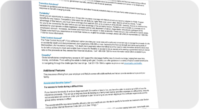 5 Travel Assistance Travel Assistance services are offered and administered by AXA Assistance USA, Inc. Certain benefits provided under the Travel Assistance program are underwritten by Certain Underwriters at Lloyd’s London (not incorporated) through Lloyd’s Illinois, Inc. Neither AXA Assistance USA Inc. nor the Lloyd’s entities are affiliated with MetLife, and the services and benefits they provide are separate and apart from the insurance provided by MetLife. ®6 Delivering the Promise This service is designed to help beneficiaries sort through the details and serious questions about claims and financial needs during a difficult time. MetLife has arranged for specially trained third-party financial professionals to be available for assistance in person or by telephone to help with filing life insurance claims, government benefits, and help with financial questions. 6 Transition Solutions Focuses on guidance and services around insurance and other financial products to help you and your family better prepare for your future in response to benefit changing events. Portability7 Gives you an opportunity to continue your Group Life insurance coverage with MetLife should you become ineligible for PEBB Program benefits for any reason. Competitive rates apply but will likely be higher than your current rates. MetLife will bill you directly. To take advantage of this feature, you must have coverage of at least $10,000 up to a maximum of $2,000,000. Generally, there is no minimum time for you to be covered by the plan before you can take advantage of the portability feature. Portability is also available on coverage you’ve selected for your spouse or state-registered domestic partner and dependent child(ren). Dependents’ amounts are contingent on the employee’s amount. Increases, decreases and maximums are subject to state availability. Please see your plan certificate for specific details. Please note that if you experience an event that makes you eligible for portable coverage, please call a MetLife representative at 1-866-548- 7139 for more information. 8 Total Control Account ® The Total Control Account (TCA) settlement option provides your loved ones with a safe and convenient way to manage the proceeds of a life or accidental death and dismemberment claim payments of $5,000 or more, backed by the financial strength and claims paying ability of Metropolitan Life Insurance Company. TCA death claim payments relieve beneficiaries of the need to make immediate decisions about what to do with a lump-sum check and enable them to have the flexibility to access funds as needed while earning a guaranteed minimum interest rate on the proceeds as they assess their financial situations. Call 1-800-638-7283 for more information about options available to you. Empathy9 Gives beneficiaries complimentary access to 24/7 support for challenges that the loss of a loved one brings, helping them save time, money, and stress. From settling the estate to dealing with grief, Empathy can offer guidance on a variety of topics to assist beneficiaries in navigating through the challenges that loss brings. Call 201-720-1584 to register via phone or visit join.empathy.com/metlife. Additional Features This insurance offering from your employer and MetLife comes with additional features that can provide assistance to you and your family. Accelerated Benefits Option10 For access to funds during a difficult time If you become terminally ill and are diagnosed with 24 months or less to live, you have the option to receive up to 80% of your life insurance proceeds. This can go a long way towards helping your family meet medical and other expenses at a difficult time. Amounts not accelerated will continue under your employer’s plan for as long as you remain eligible per the certificate requirements and the group policy remains in effect. The accelerated life insurance benefits offered under your certificate are intended to qualify for favorable tax treatment under Section 101(g) of the Internal Revenue Code (26 U.S.C.Sec 101(g)).11 Accelerated Benefits Option is not the same as long term care insurance (LTC). LTC provides nursing home care, home-health care, personal or adult day care for individuals above age 65 or with chronic or disabling conditions that require constant supervision. The Accelerated Benefits Option is also available to spouses/state-registered domestic partners insured under Dependent Life insurance plans. This option is not available for dependent child coverage.