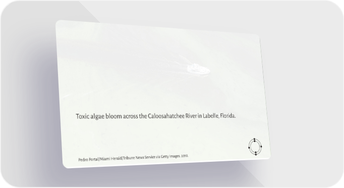 Toxic algae bloom across the Caloosahatchee River in Labelle, Florida. Pedro Portal/Miami Herald/Tribune News Service via Getty Images. 2018.