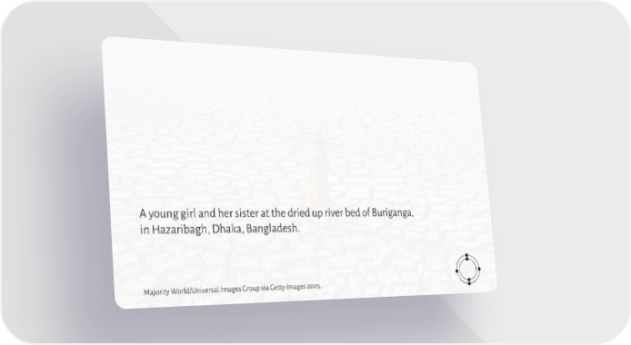 Planet in Peril Page 24 Page 26A young girl and her sister at the dried up river bed of Buriganga, in Hazaribagh, Dhaka, Bangladesh. Majority World/Universal Images Group via Getty Images 2005.