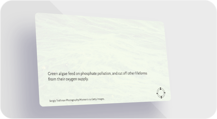 Planet in Peril Page 52 Page 54Green algae feed on phosphate pollution, and cut off other lifeforms from their oxygen supply. Sergiy Trofimov Photography/Moment via Getty Images.