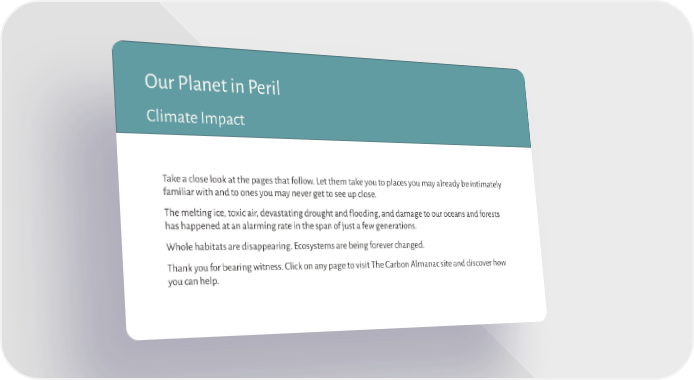 Our Planet in Peril Climate Impact Take a close look at the pages that follow. Let them take you to places you may already be intimately familiar with and to ones you may never get to see up close. The melting ice, toxic air, devastating drought and flooding, and damage to our oceans and forests has happened at an alarming rate in the span of just a few generations. Whole habitats are disappearing. Ecosystems are being forever changed. Thank you for bearing witness. Click on any page to visit The Carbon Almanac site and discover how you can help.