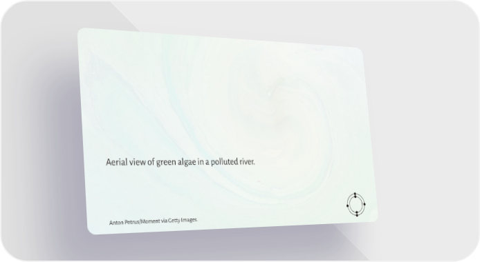 Aerial view of green algae in a polluted river. Anton Petrus/Moment via Getty Images. Planet in Peril Page 50 Page 52