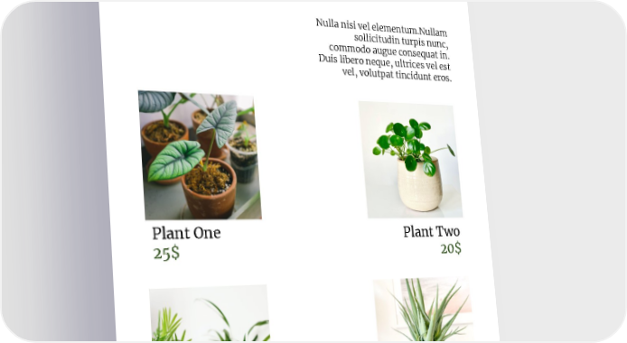 Our Plants Products Nulla nisi vel elementum.Nullam sollicitudin turpis nunc, commodo augue consequat in. Duis libero neque, ultrices vel est vel, volutpat tincidunt eros. Plant One Plant Two 25$ 20$ Plant Three Plant Four 30$ 10$