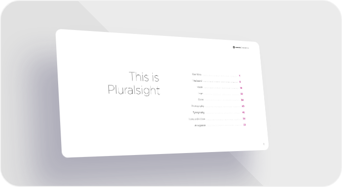 BRAND GUIDELINES Our story . . . . . . . . . . . . . . . . . . . . . . . . . . . . . . . . . . . . 4 This is The brand . . . . . . . . . . . . . . . . . . . . . . . . . . . . . . . . . . . . 8 Voice . . . . . . . . . . . . . . . . . . . . . . . . . . . . . . . . . . . . 18 Pluralsight Logo . . . . . . . . . . . . . . . . . . . . . . . . . . . . . . . . . . . . 22 Color . . . . . . . . . . . . . . . . . . . . . . . . . . . . . . . . . . . . 34 Photography . . . . . . . . . . . . . . . . . . . . . . . . . . . . . . . . . . . . 40 Typography . . . . . . . . . . . . . . . . . . . . . . . . . . . . . . . . . . . . 46 Icons and ribbon . . . . . . . . . . . . . . . . . . . . . . . . . . . . . . . . . . . . 50 At a glance . . . . . . . . . . . . . . . . . . . . . . . . . . . . . . . . . . . . 53 2