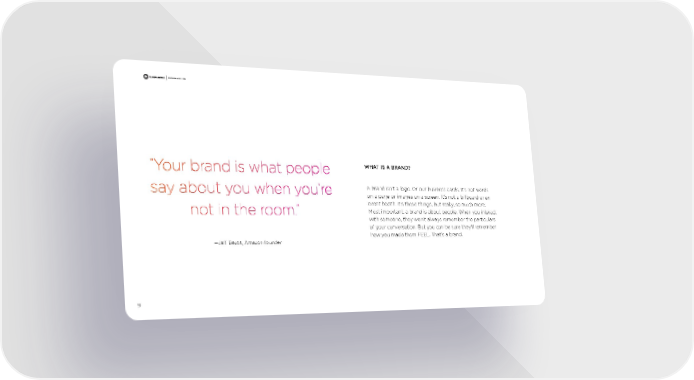 BRAND GUIDELINES “Your brand is what people WHAT IS A BRAND? say about you when you’re A brand isn’t a logo . Or our business cards . It’s not words on a page or images on a screen . It’s not a billboard or an event booth . It’s these things, but really, so much more . not in the room.” Most important, a brand is about people . When you interact with someone, they won’t always remember the particulars of your conversation . But you can be sure they’ll remember how you made them FEEL . That’s a brand . —Jeff Bezos, Amazon founder 9