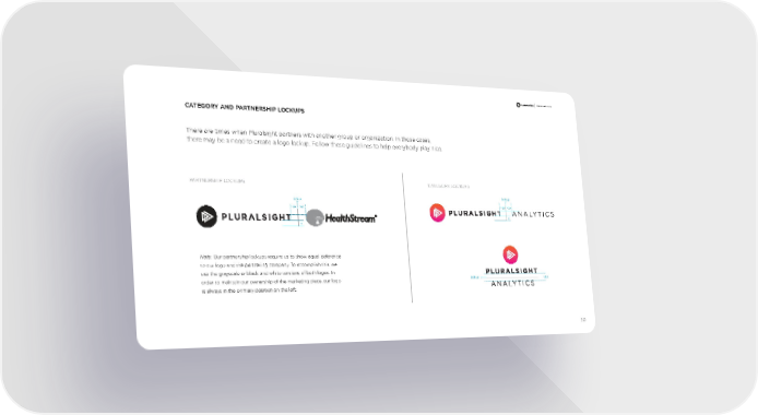 BRAND GUIDELINES CATEGORY AND PARTNERSHIP LOCKUPS There are times when Pluralsight partners with another group or organization . In those cases, there may be a need to create a logo lockup . Follow these guidelines to help everybody play nice . PARTNERSHIP LOCKUPS CATEGORY LOCKUPS 0.35 pt 0.35 pt 1.5X 1.5X 1.5X 1.5X X X Note: Our partnership lockups require us to show equal deference to our logo and the partnering company . To accomplish this, we use the grayscale or black and white versions of both logos . In order to maintain our ownership of the marketing piece, our logo 0.35 pt 1.5X is always in the primary position on the left . 30
