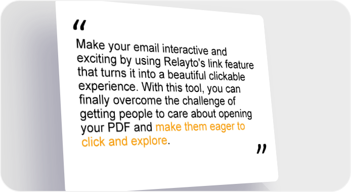 Make your email interactive and “ exciting by using Relayto's link feature that turns it into a beautiful clickable experience. With this tool, you can finally overcome the challenge of getting people to care about opening “ your PDF and make them eager to click and explore.