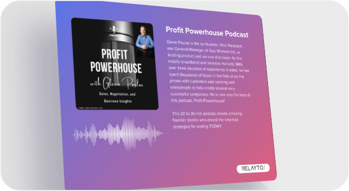 Profit Powerhouse Podcast Glenn Poulos is the co-founder, Vice President, and General Manager of Gap Wireless Inc., a leading product and service distributor for the mobile broadband and wireless markets. With over three decades of experience in sales, he has spent thousands of hours in the field or on the phone with customers and working with salespeople to help create several very successful companies. He is now also the host of this podcast, Profit Powerhouse! This 20 to 30-min podcast shares amazing founder stories who reveal the smartest strategies for scaling TODAY.
