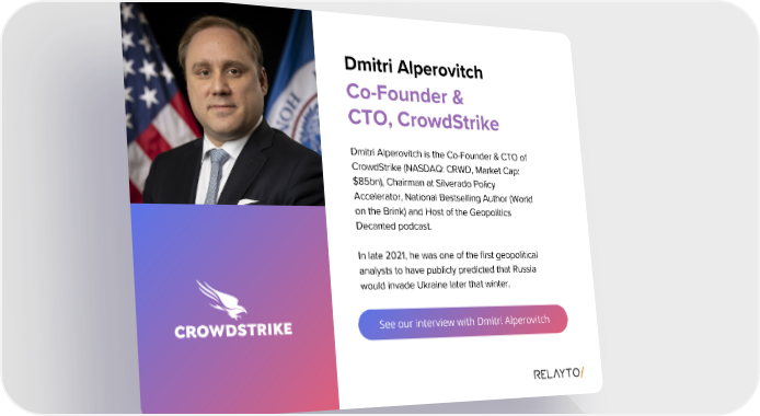 Dmitri Alperovitch Co-Founder & CTO, CrowdStrike Dmitri Alperovitch is the Co-Founder & CTO of CrowdStrike (NASDAQ: CRWD, Market Cap: $85bn), Chairman at Silverado Policy Accelerator, National Bestselling Author (World on the Brink) and Host of the Geopolitics Decanted podcast. In late 2021, he was one of the first geopolitical analysts to have publicly predicted that Russia would invade Ukraine later that winter. See our interview with Dmitri Alperovitch