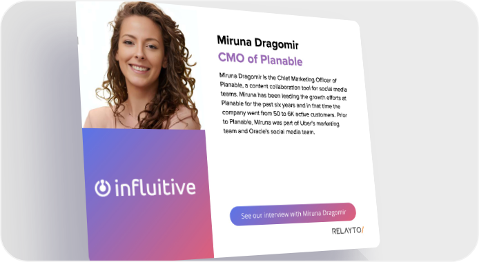 See our interview with Miruna Dragomir Miruna Dragomir Miruna Dragomir is the Chief Marketing Officer of Planable , a content collaboration tool for social media teams . Miruna has been leading the growth efforts at Planable for the past six years and in that time the company went from 50 to 6K active customers . Prior to Planable , Miruna was part of Uber ' s marketing team and Oracle ' s social media team . CMO of Planable