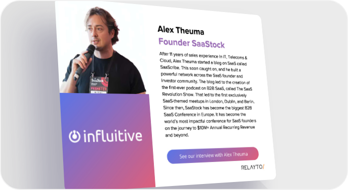 See our interview with Alex Theuma Alex Theuma After 11 years of sales experience in IT , Telecoms & Cloud , Alex Theuma started a blog on SaaS called SaaScribe . This soon caught on , and he built a powerful network across the SaaS founder and investor community . The blog led to the creation of the first - ever podcast on B2B SaaS , called The SaaS Revolution Show . That led to the first exclusively SaaS - themed meetups in London , Dublin , and Berlin . Since then , SaaStock has become the biggest B2B SaaS Conference in Europe . It has become the world ’ s most impactful conference for SaaS founders on the journey to $ 10M + Annual Recurring Revenue and beyond . Founder SaaStock