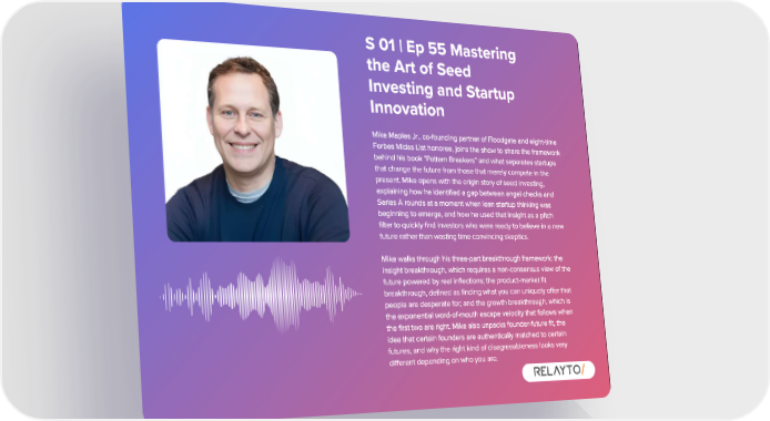S 01 | Ep 55 Mastering the Art of Seed Investing and Startup Innovation Mike Maples Jr ., co - founding partner of Floodgate and eight - time Forbes Midas List honoree , joins the show to share the framework behind his book " Pattern Breakers " and what separates startups that change the future from those that merely compete in the present . Mike opens with the origin story of seed investing , explaining how he identified a gap between angel checks and Series A rounds at a moment when lean startup thinking was beginning to emerge , and how he used that insight as a pitch filter to quickly find investors who were ready to believe in a new future rather than wasting time convincing skeptics . Mike walks through his three - part breakthrough framework : the insight breakthrough , which requires a non - consensus view of the future powered by real inflections ; the product - market fit breakthrough , defined as finding what you can uniquely offer that people are desperate for ; and the growth breakthrough , which is the exponential word - of - mouth escape velocity that follows when the first two are right . Mike also unpacks founder - future fit , the idea that certain founders are authentically matched to certain futures , and why the right kind of disagreeableness looks very different depending on who you are .