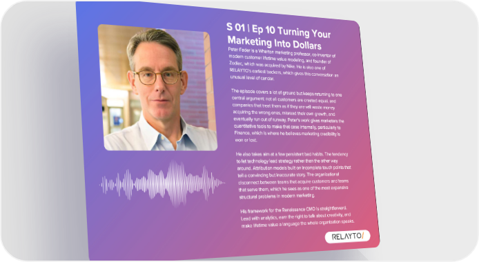 S 01 | Ep 10 Turning Your Marketing Into Dollars Peter Fader is a Wharton marketing professor , co - inventor of modern customer lifetime value modeling , and founder of Zodiac , which was acquired by Nike . He is also one of RELAYTO ' s earliest backers , which gives this conversation an unusual level of candor . The episode covers a lot of ground but keeps returning to one central argument : not all customers are created equal , and companies that treat them as if they are will waste money acquiring the wrong ones , misread their own growth , and eventually run out of runway . Peter ' s work gives marketers the quantitative tools to make that case internally , particularly to Finance , which is where he believes marketing credibility is won or lost . He also takes aim at a few persistent bad habits . The tendency to let technology lead strategy rather than the other way around . Attribution models built on incomplete touch points that tell a convincing but inaccurate story . The organizational disconnect between teams that acquire customers and teams that serve them , which he sees as one of the most expensive structural problems in modern marketing . His framework for the Renaissance CMO is straightforward . Lead with analytics , earn the right to talk about creativity , and make lifetime value a language the whole organization speaks .